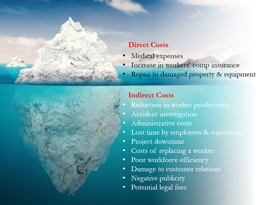 Often it is very difficult to ascertain the true impact that a single workplace injury can have on an impacted project or company. It has often been said that the cost that you cannot see (indirect costs) can be between 1 - 10 times the cost of direct costs. Numerous factors may affect this cost including injury severity, duration of recovery, and the type of impact that a missing worker may have on the work crew and project among many, many others.