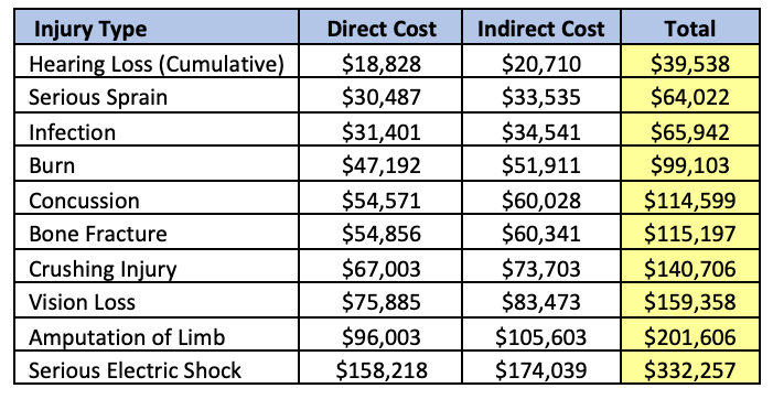 The actual cost of just one injured worker adds up quickly. To help understand the true cost of a workplace injury, OSHA provides a cost estimate worksheet as part of its Safety Pays Program. This process is simple, but the results are surprising. Examples of the average estimated cost by injury have been calculated to be as follows: